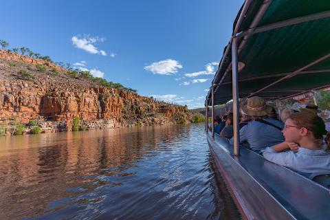 Discover the wonders of Chamberlain Gorge on an immersive boat excursion. This pristine oasis, encircled by diverse wildlife and towering cliffs, offers a unique 3 km journey accessible only by boat. Enjoy the tranquil setting, accompanied by sparkling wine and fresh fruit, while your Ranger entertains you with fascinating stories about the playful Archerfish inhabiting the waters.